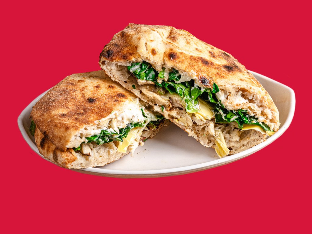 시금치, 아티초크, 표고 버섯, 적양파, 모짜렐라, 염소 치즈를 함께 사워도우에 말아구운 요리와 마리나라와 아이올리 디핑 소스